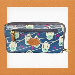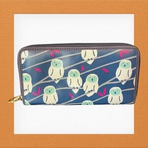 Authentic Fossil Blue Owl Print Zip Around Wallet Pink Interior Key Ring Accent