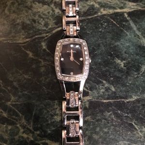 Authentic Fossil watch. Gently worn, great condition. Silver and black with white stones. Comes with original box, instruction manual, care card, original tags, and extra links. One rhinestone missing, see pictures for details. No battery.