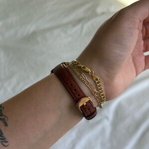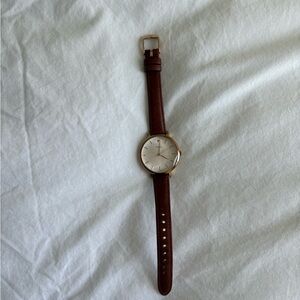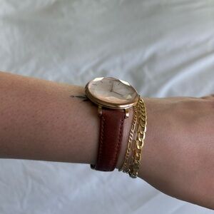 This beautiful authentic fossil watch in rose gold has a raised face with faceted edges on the glass, creating beautiful light reflection. It has a leather fossil strap in dark brown as shown in the photos. Needs a fresh battery!