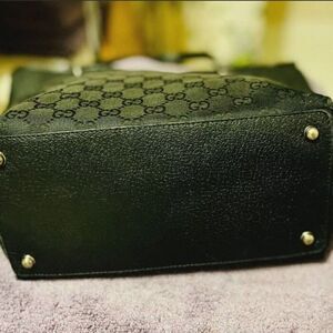 FEATURES: BY: GUCCI From the "ECLIPSE" Collection Style....120836-112958. Tote, carryall Monogram GG Canvas with LEATHER Trim. The monogram GG canvas is BLACK The Leather trim is a BLACK LEATHER. TWO Leather Handles SILVER Gunmetal hardware with Gucci name on it 13 " H X 14" W across top and middle, 10" W across very bottom area BUCKET SHAPE....wider at the top and narrows down INSIDE: Black lined. one large ZIP pocket. One slip pocket. Leather Tag and SERIAL NUMBERS BODY Fabric is in good condition all over. NO holes or rips. Leather Handles are in good condition. A few corners show scuffs/rubbed areas from mild to moderate. See Pics please. Bottom leather looks good also ( a few mild marks/scratches). Inside is lightly used.