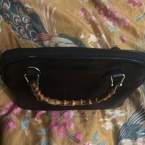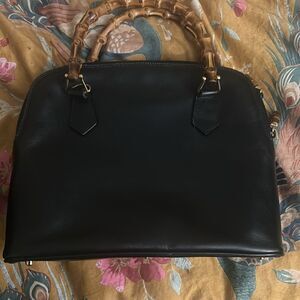Elegant black handbag featuring unique bamboo handles. Perfect for any occasion.