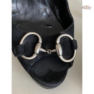 Authentic GUCCI Black Suede Leather Horsebit Peep-Toe Platform Pumps 36C/6C