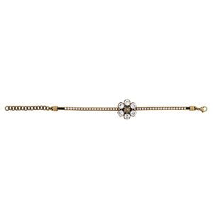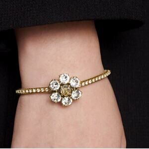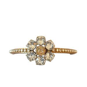 This bracelet is adorned with the unmistakable symbol of the house: the initials of the founder, Guccio Gucci. Clear crystals frame the metal logo with an old gold finish and create a luxurious touch.