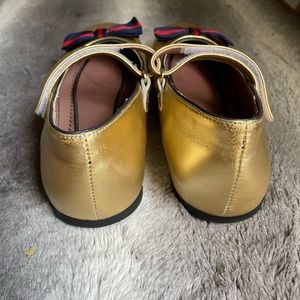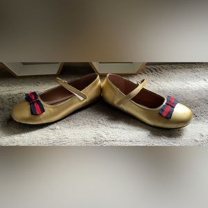 Girls authentic Gucci gold metallic ballet flats with bow! Purchased and worn once inside ( a few light scuffs on the sides ) box not included. Size 35. Item features…