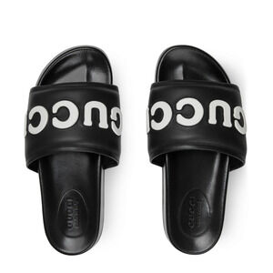 GUCCI's branding is boldly patched in white against black leather on these logo slides. The slip-on style adds practicality.