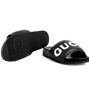 Authentic GUCCI Men's Logo Leather Slide Sandal in Black