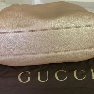 Authentic Gucci Pebbled Leather Sukey bag - light metallic Dusty Rose Gold - Excellent Condition!! Handle drop is 6”, 14” L x 11” H (at center) x 5” W. Has snap closure at top and on both sides. Double rolled leather handles. Gold tone Gucci hardware. Canvas lining is super clean and has a single zippered interior pocket. This bag is gorgeous and well taken care of. It has a few very small stains on outside - barely noticeable-see photos where I can circled the 2 stains. Also the corners are perfect - see photos!!Has a GG hanging charm. This bag comes from a Smoke free home.This bag is gorgeous and well worth the money. The only reason it’s for sale is because I found one I like better!! Excellent Condition!!!