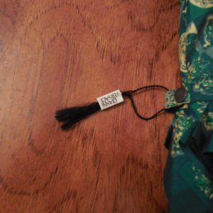 Beautiful!!! Green & Gold Medusa heads authentic Versace umbrella. Versace logo tag along with metal plate on handle. Tip of umbrella is missing as shown in pictures. Handle has minor scratches. Fabric and function is perfect. Opened, umbrella measures approx. 40" wide tip to tip.