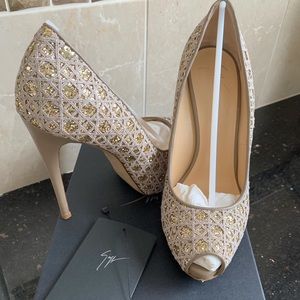 Slightly worn Sharon Glitter Platform Pump, Oro/Sand Beige and gold canvas 'Sharon' glitter platform pumps from Giuseppe Zanotti Design featuring a peep toe, a brand embossed insole and a high stiletto heel. wedge: 4.5 centimetres, heel: 5.5Inches Leather 100% Leather 100% PVC 100% Canvas 100%