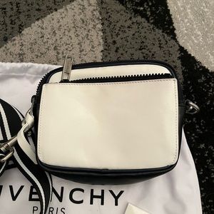 Authentic Givenchy MC-3 Cross Body bag in blue and white. The perfect every day crossbody. Emblazoned with the Givenchy logo with two toned blue/white on one side and solid white on the other. One outside pocket and removable striped cross body strap . Approx 6” high and 8 “ across . Used once and comes with original tags and dust bag.