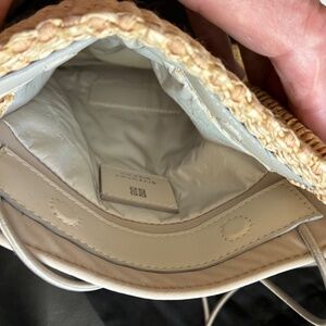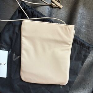 A new, never used Givenchy cross-body bag / phone pouch with a woven raffia front side branded “GIVENCHY” and a plain back side in tan fabric. Tan fabric lining in interior with leather trim. Magnetic mechanism for opening and closing bag. Elastic strap/ cord for wearing the bag which is approx. 42 inches long, with mechanism to adjust strap length. The bag measures approx. 8 inches x 6 inches. Comes with Givenchy dust bag and original authenticity cards.