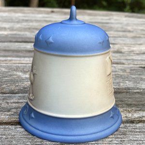 Pristine Condition. No Chips. No Cracks. No fading. Sweet Design in Soft Blue and Beige Colors. Made in Germany. Comes with Original Box and Never Used/Brand New Ribbon for Bow at Top of Bell. This Bell Designed with a Clapper. Please see photos.