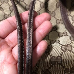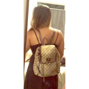 Authentic vintage Gucci backpack. Still in good condition. Bottom and sides of bag has dirty areas but not noticeable on Gucci Canvas. Interior has a large zip pocket and a cell phone pocket and is overall clean with no spills or stains. Gold hardware still shines. Gucci logo is fading. Leather shows sign of aging. Loved this backpack as it is comfortable and leaves you hands free.