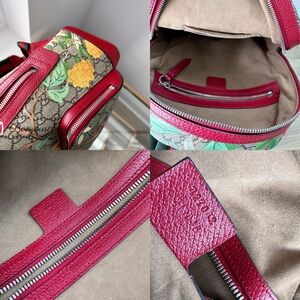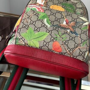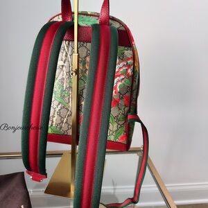 Elegant Gucci backpack with multicolor floral design. Features signature GG pattern and red leather accents. In great used condition. Check the closet for more!