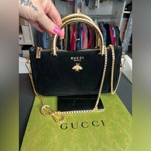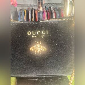 Stunning! New authentic from Gucci beauty collection. Velvet cosmetic bag converted into a crossbody with unbranded gold plated chain, handles and bee that I added. The bag is Gucci, the hardware is not. Bag is measured at 9.5 X 6 X 2.2 inches! Super cute and new condition.
