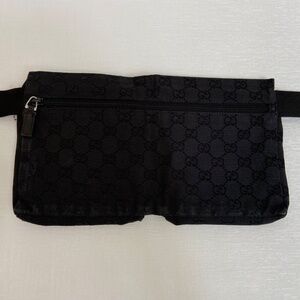 This authentic Gucci belt bag features classic black GG canvas with smooth leather accents and an adjustable strap for versatile wear. Perfect for both men and women, it can be worn around the waist, across the chest, or over the shoulder. Ideal for everyday use or travel.