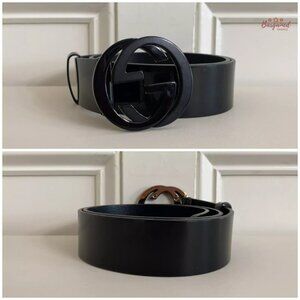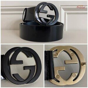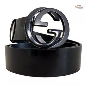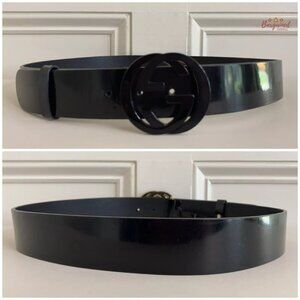 Authentic Gucci Black Glossy Leather Black/Gold Interlocking G Buckle Belt 85/34