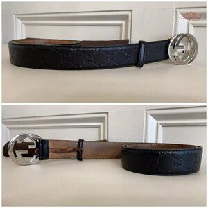 Authentic Gucci Black Guccissima Leather Silver Interlocking G Buckle Belt 85/32