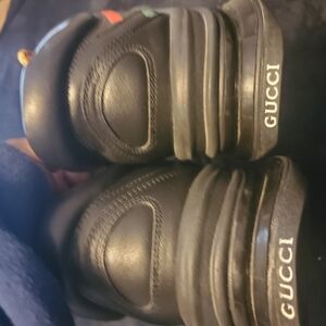 Authentic men's Gucci shoe's green red leather paneled design rubber soles GG Supreme canvas size 9 practically brand new