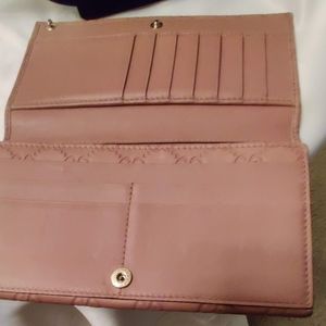 Gucci Signature GG logo Pink Continental leather wallet with raise logo imprints and gold tone metal charm attached.