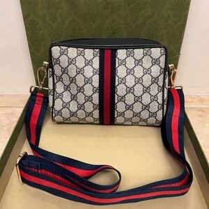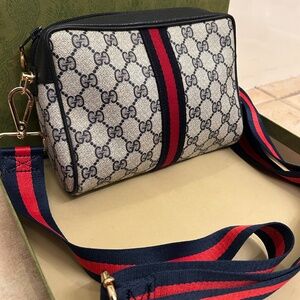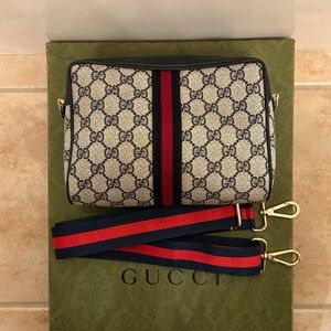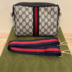 Authentic Gucci Crossbody bag with non branded hardware/47”in cross body purse strap. Outside of purse looks great. Zipper glides smooth and the corners are in good condition. Inside of bag has scuffs and blemishes, no holes, rips of foul odor. Gucci purse is gently used and shows little signs of wear. Canvas in great condition as well as the shell of purse. Purse comes with Blue and Red Cross Body purse strap and purse is packaged with care when shipping.