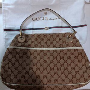 Beige Gucci logo fabric with white leather trim. This bag measures 15" x 8-1/2" (wide x height). The metal fittings show some slight wear as seen in the photos. Comes with a genuine Gucci dust bag (see photos). The top edge looks wrinkled due to softness of inside leather trim. There is one zip pocket inside and a slip pocket on the outside front. Comes from smoke-free home. Magnetic snap closure. The condition is very good with no tears or stains. If you have any questions, please don't hesitate to ask.