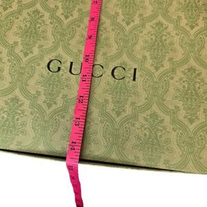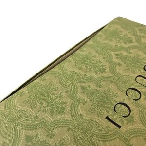 Authentic Gucci Empty Green Embossed Magnetic Box 14.5" L x 11" W x 4.75" H. Box is empty. Color is green with embossed beautiful design. Magnetic attached top closure. Includes tissue paper shown. Quality sturdy construction.