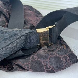 Authentic Gucci GG Black Canvas Crossbody / Messenger Bag featuring signature GG monogram fabric, leather trim, and gold-tone hardware. Adjustable web strap allows for shoulder or crossbody wear. Spacious interior with secure zip closure — perfect for travel or everyday wear.
