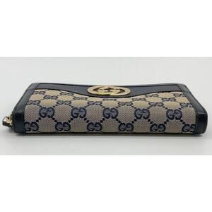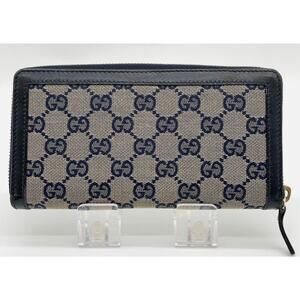 Authentic Gucci GG Canvas Round Zipper Navy Long Wallet
