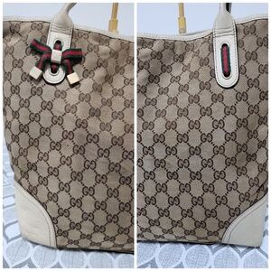 This authentic 🙌 Gucci GG Canvas New Britt Medium Bag is in it’s pre-owned condition. The exterior canvas shows some sign of wear. Rubbing and aging. The off-white leather shows rubbing and scratches .