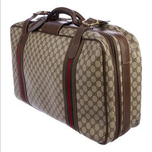 Authentic vintage Gucci GG canvas with antiqued gold one hardware. Brown leather trim, single flat top handle, green and red web panels at front and back, dual compression straps and two-way zip around closure with additional push lock closure at top. Zipper needs to be replaced, does not function. Exterior canvas is in excellent condition, piping shows signs of wear in all four corners. Interior has Noticeable stains, Old odor and loose shape. Measurements approximately: Width: 26”, Height: 16”, Depth: 7”.