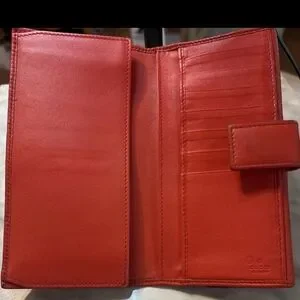 Luxurious Gucci wallet in scarlet leather. Features iconic embossed design. Ideal for chic everyday use.