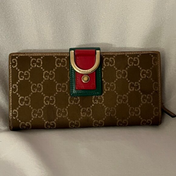 Authentic Gucci GG leather Long Wallet Snap Zip Closures Brown Green Red Accent
