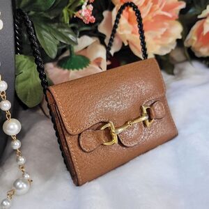 Beautiful brown leather 6 key ring holder. Brass horsebit detail on front. Flap tucks into Horsebit. Inside and out are in great condition. Minor rubbing on inside feom keyring hardware.