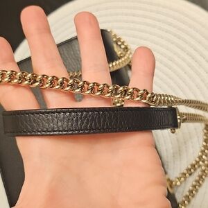Chic Gucci crossbody bag in black leather. Features a striking gold chain strap and logo detail. Perfect for any occasion.
