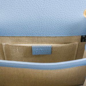 Crafted from leather in a light blue hue, this authentic Gucci shoulder bag is styled with a flap that has the interlocking GG. This bag features two compartments on the interior so you can stay organized; the handbag can be worn as a shoulder bag or crossbody, making it perfect to carry your necessary belongings. This bag has a spacious leather interior and a gorgeous gold-tone chain link for an easy carrying experience.