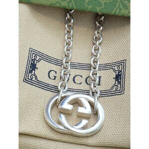 Authentic Gucci necklace featuring the iconic interlocking GG logo. Crafted from sterling silver with a 16" chain and a pendant measuring 1 Inch length and width 0.6 Inch