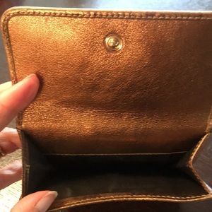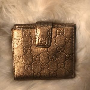 Gucci Leather Bifold Wallet. Made in Italy Exclusively for Neiman Marcus. EUC beautiful Gold with logo embossed exterior. Pocket purse front with snap enclosure, snap enclosure on back. Interior with two slip pockets, and multiple card slots. Clean interior and exterior with minor scuffs. In good used condition!