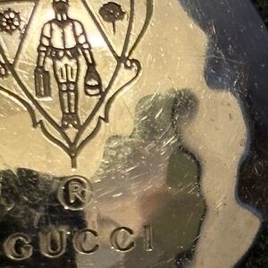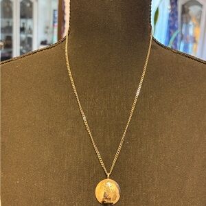 Stylish Gucci medallion necklace. Features a detailed emblem on a twisted chain.