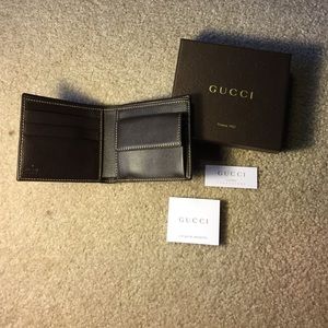 AUTHENTIC Men's GUCCI Logo canvas bifold wallet genuine leather, NEW -- never used -- has just sat delicately in original box in closet for a few years. * Please note: I will not budge on the price listed ๐ this is a high quality item and is in perfect condition, thank you for understanding*