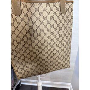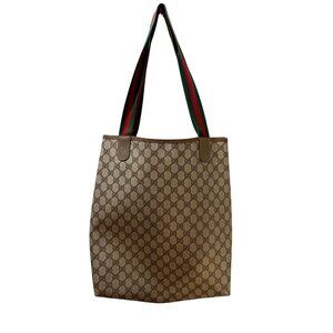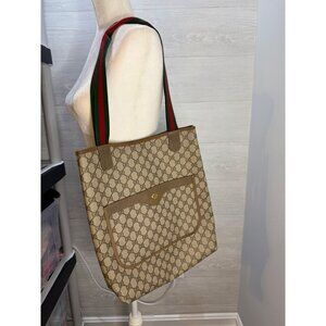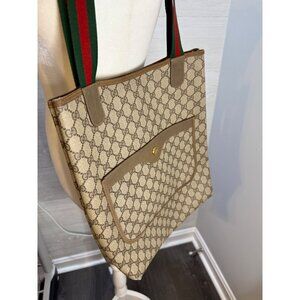 Authentic Gucci Monogram Canvas Tote Bag W/ Front Pocket & Green/Red Straps