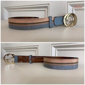 Authentic Gucci Multi Web Canvas Leather Gold Interlocking G Buckle Belt 85/34