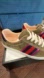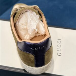 Authentic Gucci Olive Green Suede Sneakers with Red and Blue Stripes