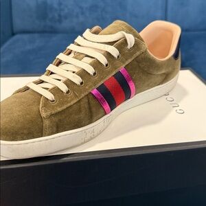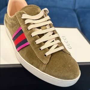 Authentic Stylish Suede Gucci sneakers in olive green. Features red and blue stripes. Comfortable and trendy design. Minor dirt marks that can be washed off no real wear and tear