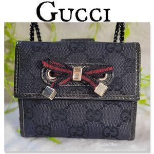 This is an Authentic Gucci Princy GG Canvas Compact French Wallet. With a canvas body that has the Gucci G logo and leather trimmed edges. The front of the wallet has a black and red ribbon with gold toned accent pieces. This is a vintage waller and is in excellent condition. Compact but perfect for all of the necessities for every day use. The edges are in great condition as seen in the photos. Both snaps snap perfectly and hold securely. The side that has the bow opens up to a 2 pocket change pocket. The back side opens up to a bill pocket and 8 card slots.