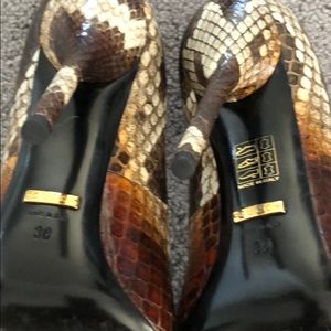 Absolutely stunning. It’s a shame they just sit in my closet when they could be in yours! Closed toe with peep toe cleavage detail and flawless. Only wear is shown on soles. Enjoy these!!!! They are PYTHON!