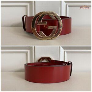 Authentic Gucci Red Coated Leather Gold Interlocking G Buckle Belt 85/34