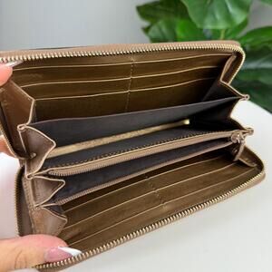 Add a touch of timeless elegance with this Gucci Shine Microguccissima Lovely Heart Wallet in metallic bronze. Crafted from embossed Microguccissima leather, this chic wallet features Gucci’s signature heart detail for a feminine and stylish finish. The secure zip around closure opens to a spacious interior with card slots, bill compartments, and a coin pocket perfect for organizing your essentials.