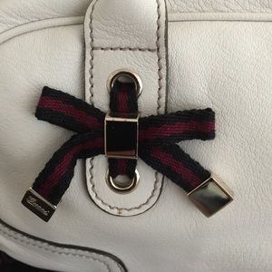 Bag purchased in the San Francisco Gucci store w/coordinating heels also for sale. Bag is off white/light cream w/signature bows & gold detail as pictured - front & zipper. Inside includes beautiful purple liner with the signature GG, zippered pocket & a smaller compartment for cell phone or misc storage. Dust bag, authenticity cards included which how it's been stored in smoke free home. Dimensions 13"L x 6.5" H x 5"D. There are 2 small dents in front. Should diminish out after time.
