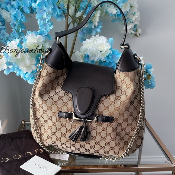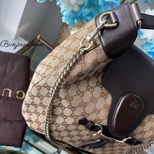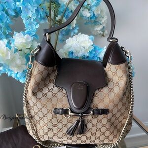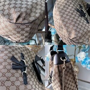 Chic Gucci shoulder bag with iconic pattern. Rich brown leather accents. Perfect for stylish outings. In new condition, check the closet for more designer items.